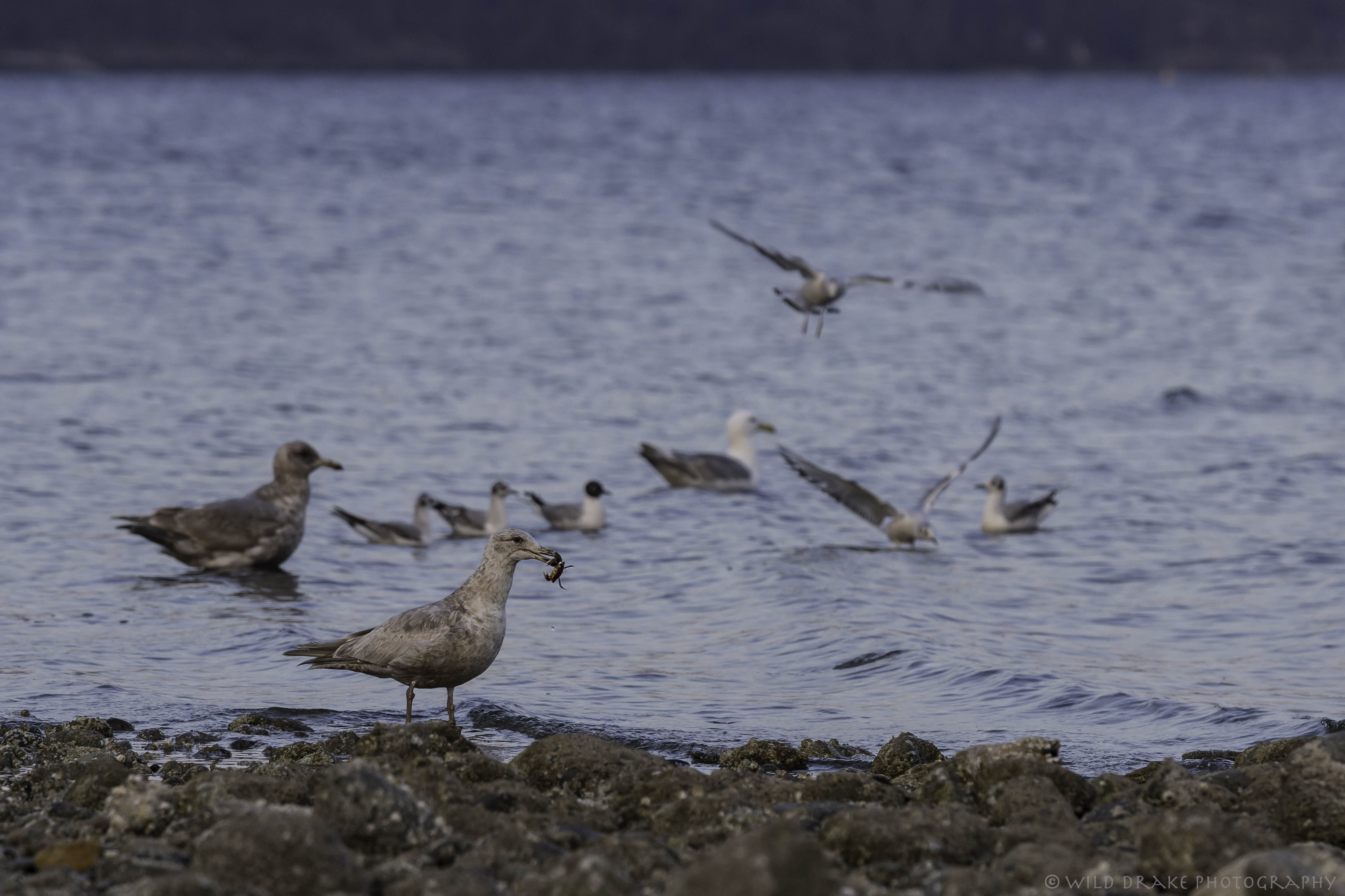 Upon closer inspection I could see one of the gulls was snacking on a young crab.