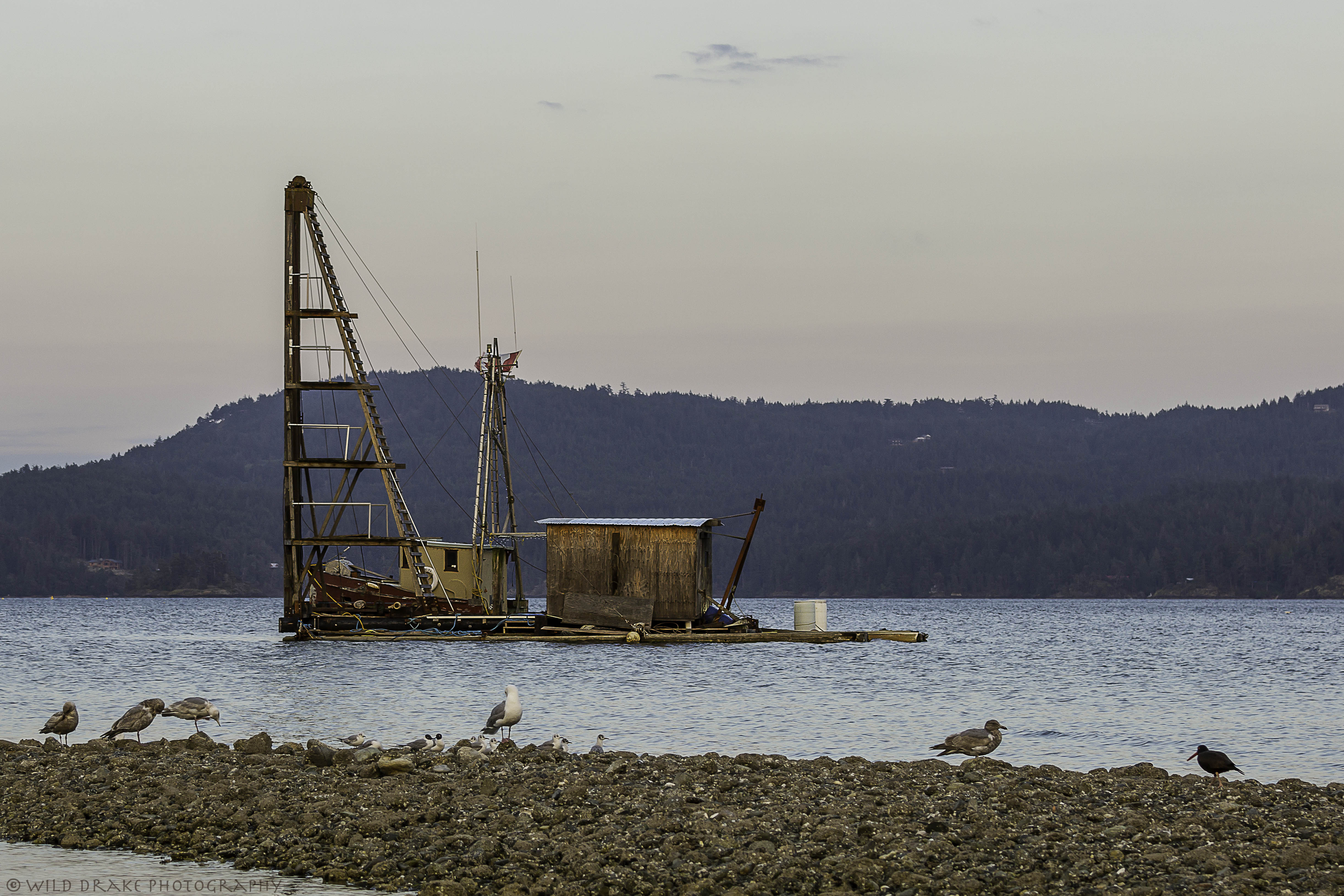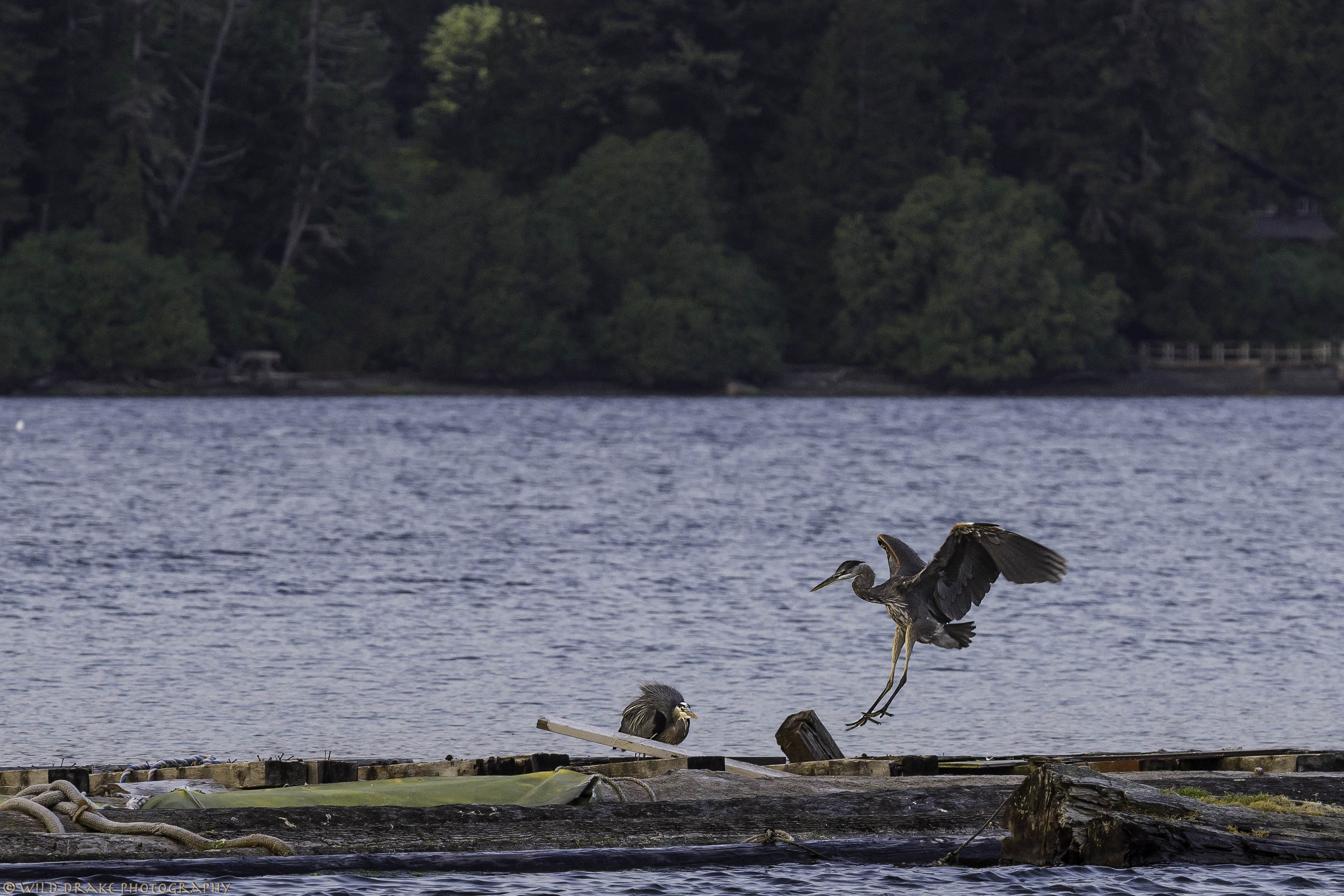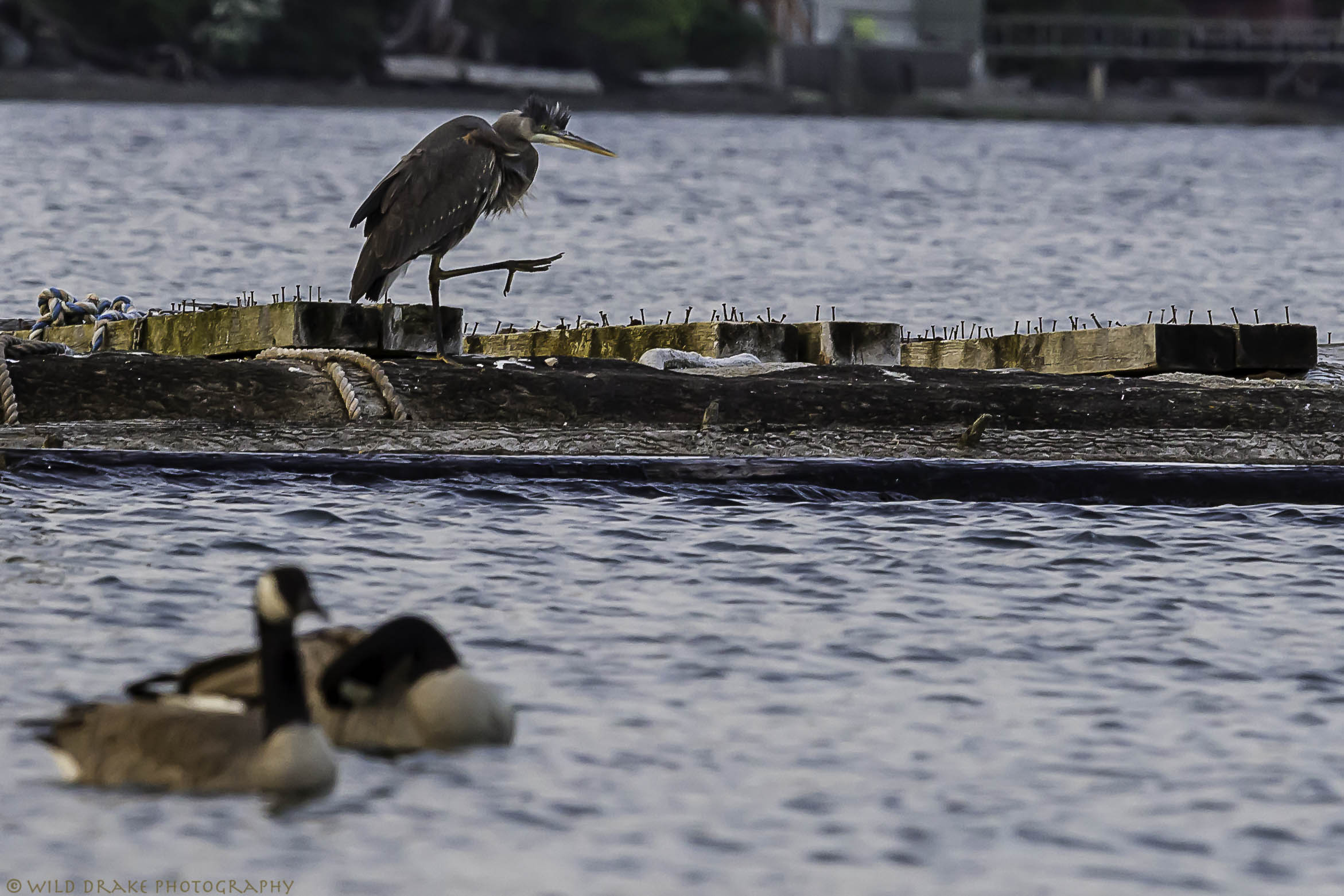 A short distance across the water, several Great Blue Herons rest on an old floating wooden structure that is lined with nails.