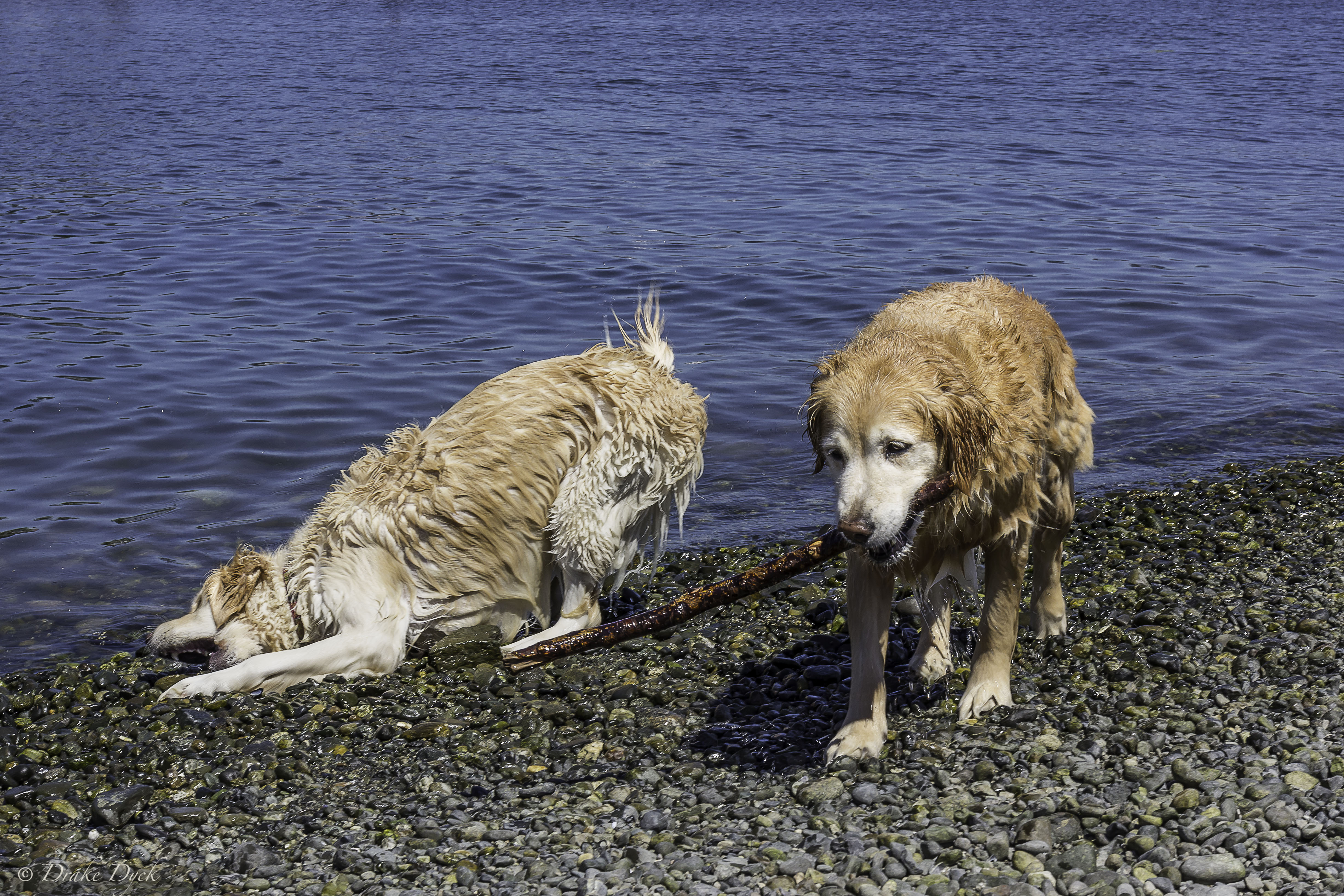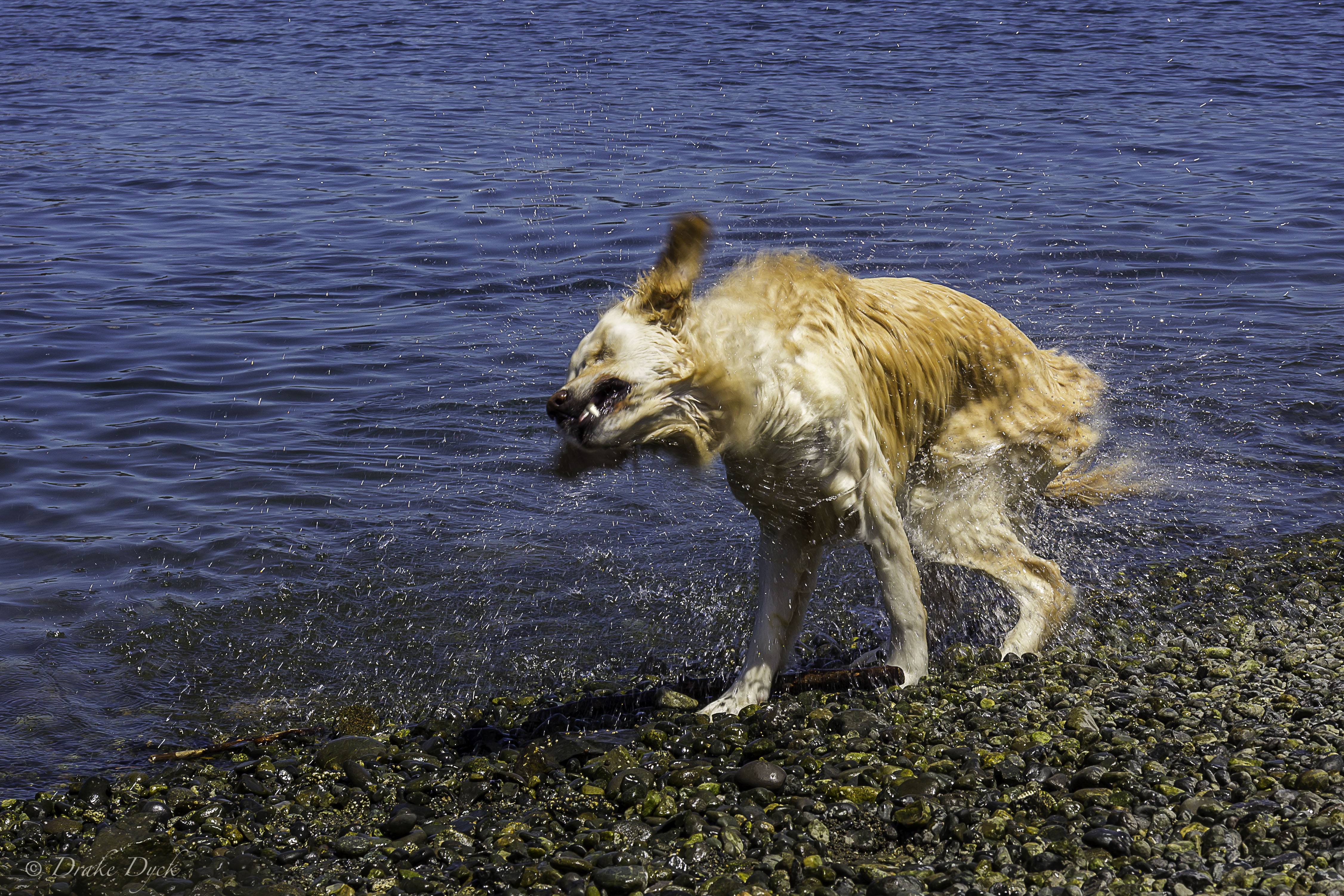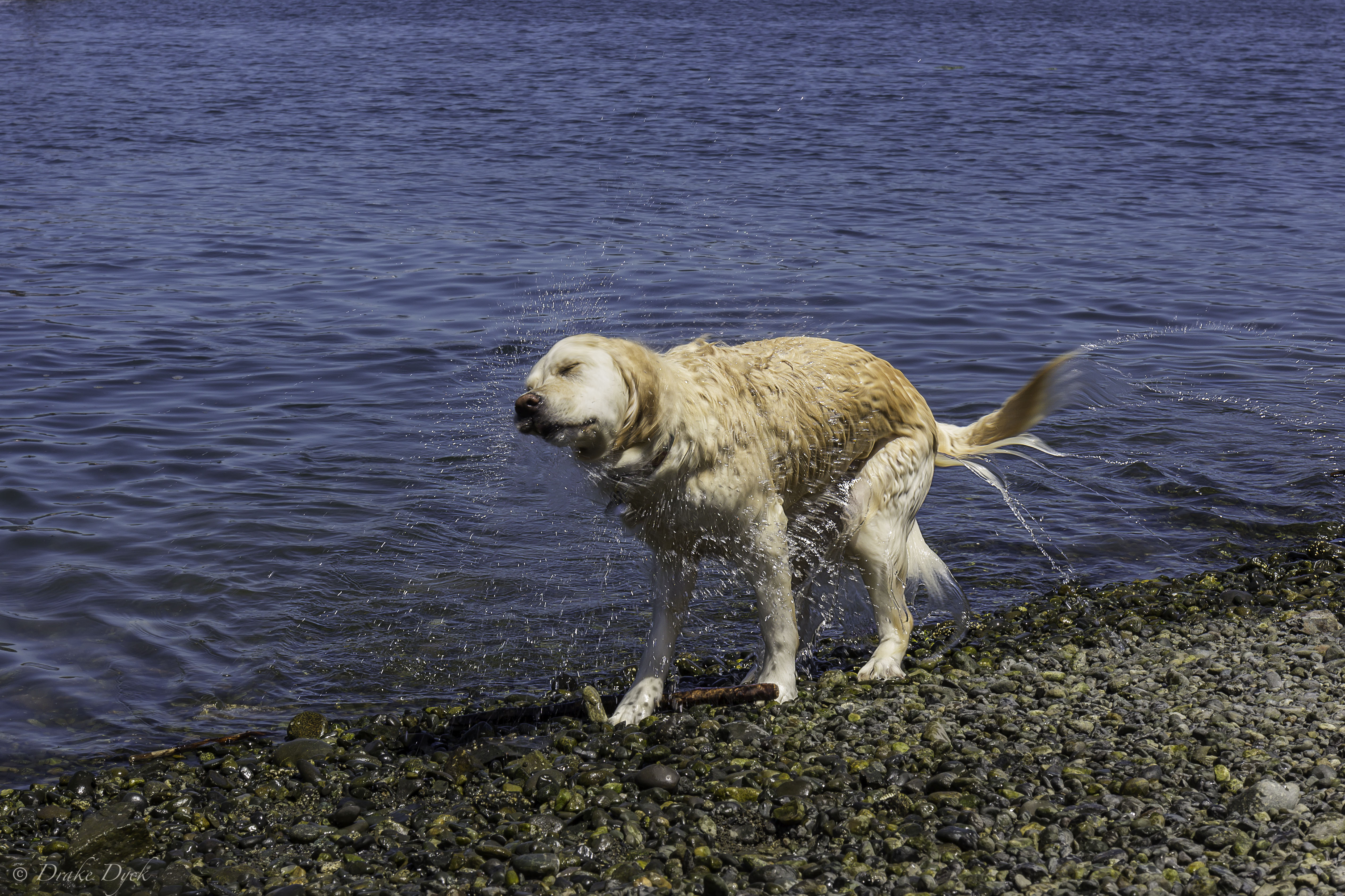Every time they get out they have to drop the stick (if they have one) and then twist and shake the water off, often as close to me and my camera as possible.