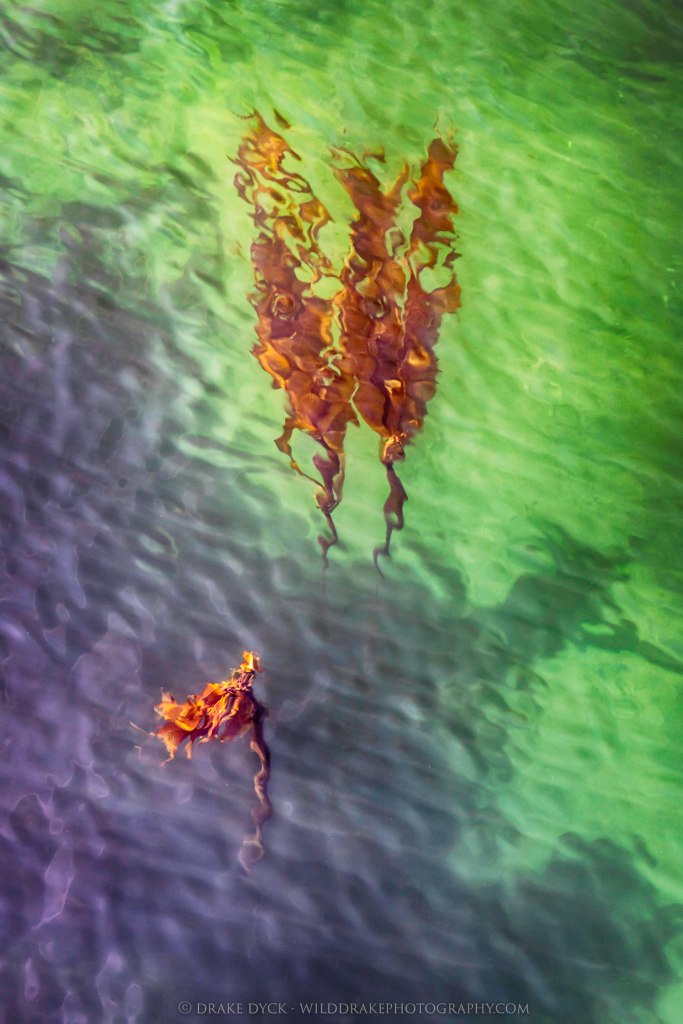 Looking down on this floating bull kelp, I found the contrast between the lighter sandy bottom and the darker area where the pier cast a shadow on the ocean floor interesting.