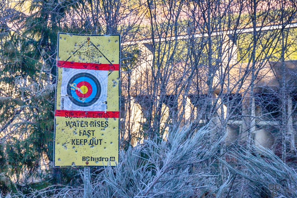 One of the first things I noticed was a yellow warning sign, which had a bullseye target taped to it, and had been shot to hell. Although hard to tell without looking closely, the sign warns that when the siren sounds the water may rise fast, due to operation of the diversion dam. Nearby, there was a large circle of rocks that someone had made for a fire pit, and close to that were several deteriorating boxes of used shotgun shells and other debris. Sadly, this wasn’t the only area along my drive on the backroads that I saw this type of junk, along with other trash.