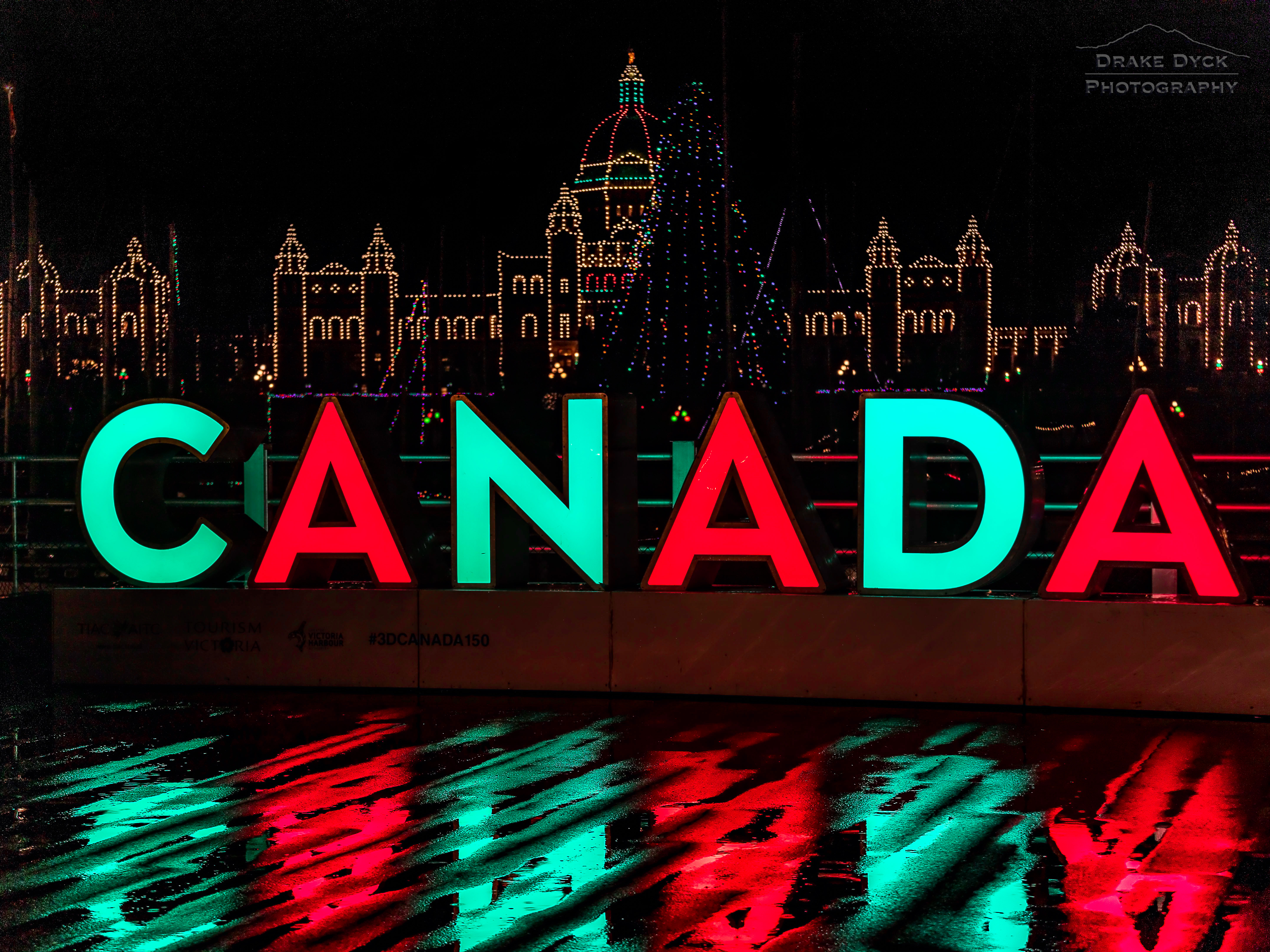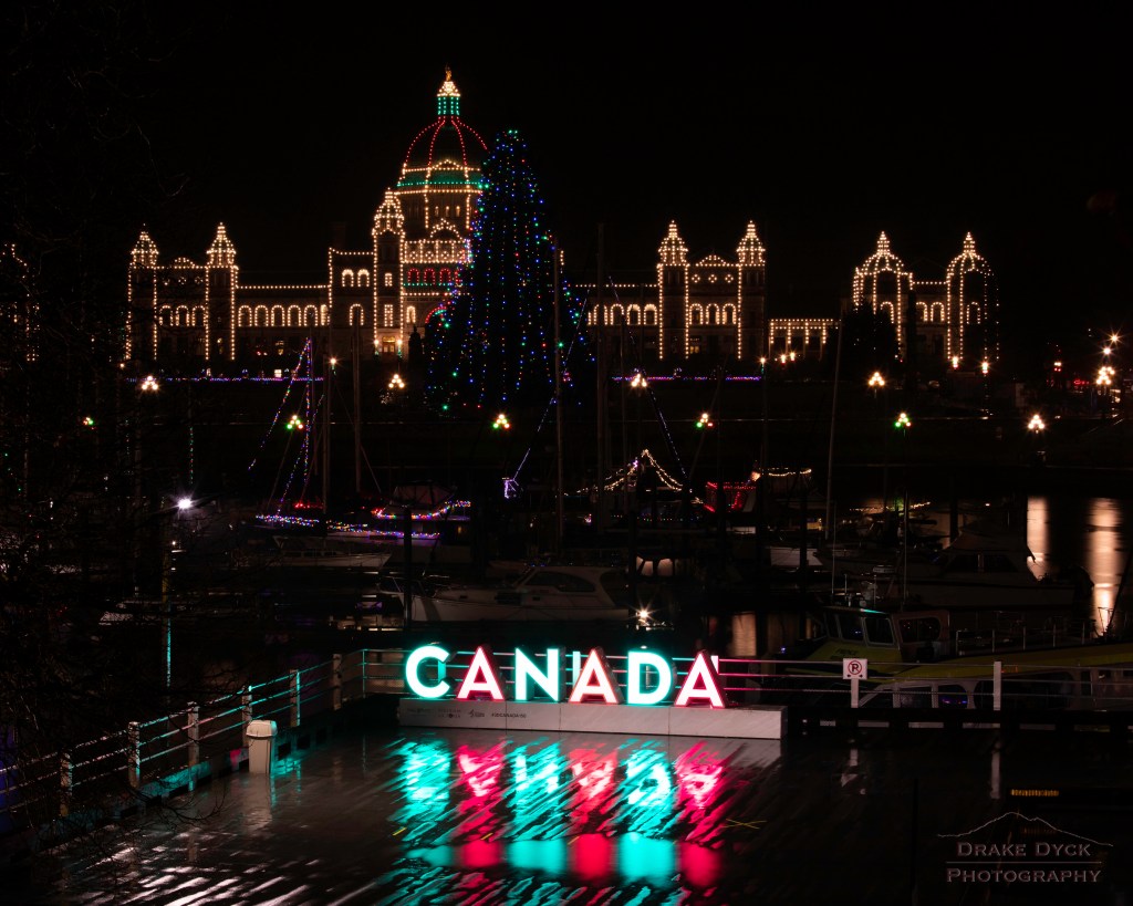 The view across the harbour to the BC Legislature buildings, with it’s colourful holiday lighting and light adorned tree our front, is the typical shot I’ve taken here in past years. This year I went further back, so I could capture the Canada sign (which was put there several years back as “Canada 150”, for 150 years since Confederation and since has had the “150” removed) and reflections on a rainy day.