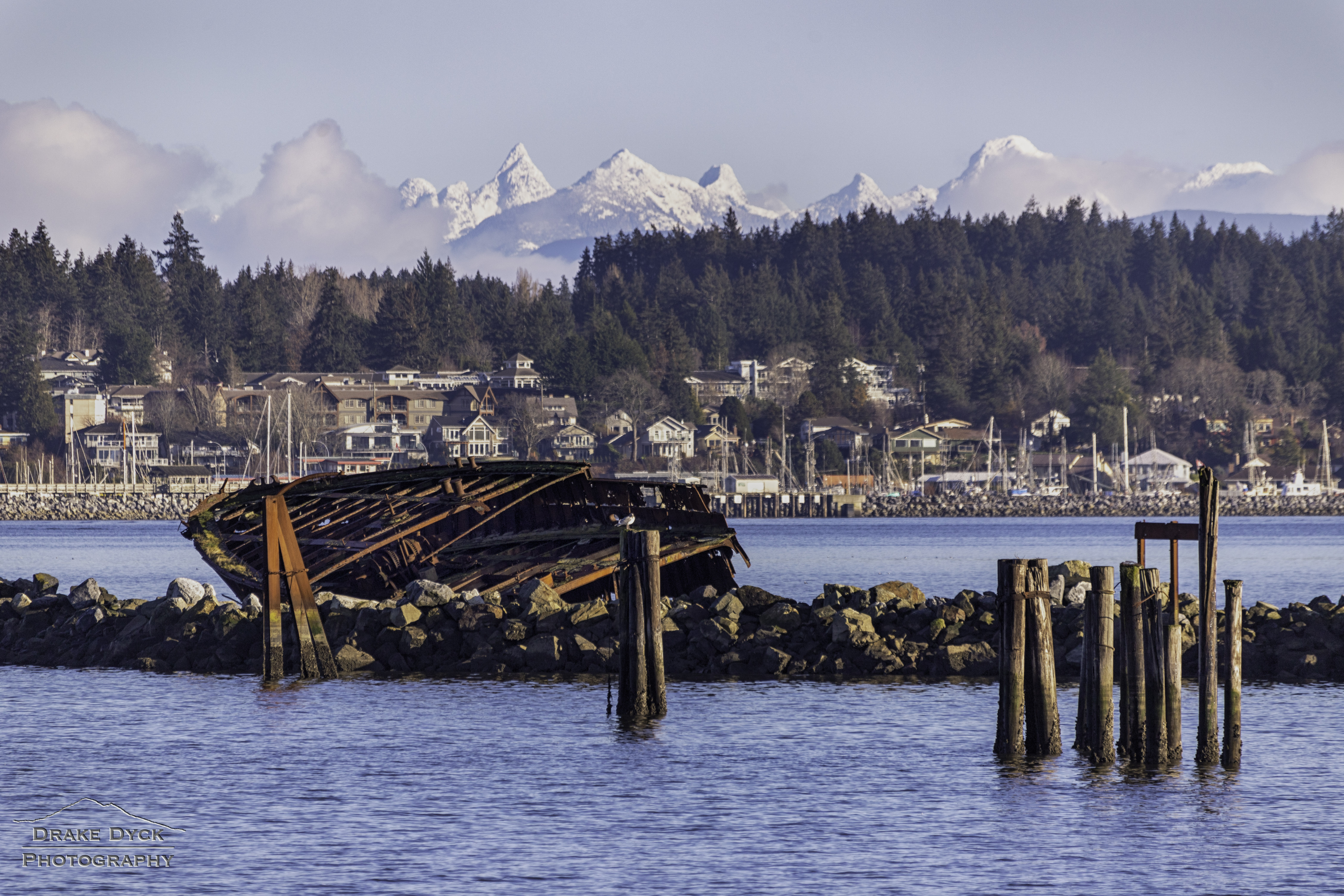 I went to explore the shipwrecks that are part of this breakwater and couldn’t get as close to them as I’d have liked, but as a result had to work around other angles and found this one, which features the mountains and the town of Comox in the background.